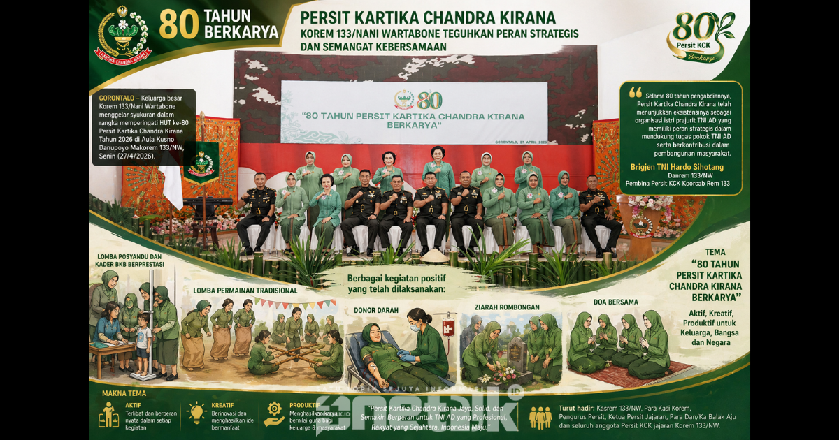 onetalk.co.id GORONTALO – Suasana penuh kehangatan, kebersamaan, dan semangat pengabdian mewarnai peringatan Hari Ulang Tahun (HUT) ke-80 Persit Kartika Chandra Kirana yang digelar keluarga besar Korem 133/Nani Wartabone, Senin (27/4/2026). Kegiatan yang dipusatkan di Aula Kusno Danupoyo Makorem 133/NW ini menjadi momentum penting dalam memperkuat citra positif organisasi sebagai pilar pendukung ketahanan keluarga dan sosial masyarakat.