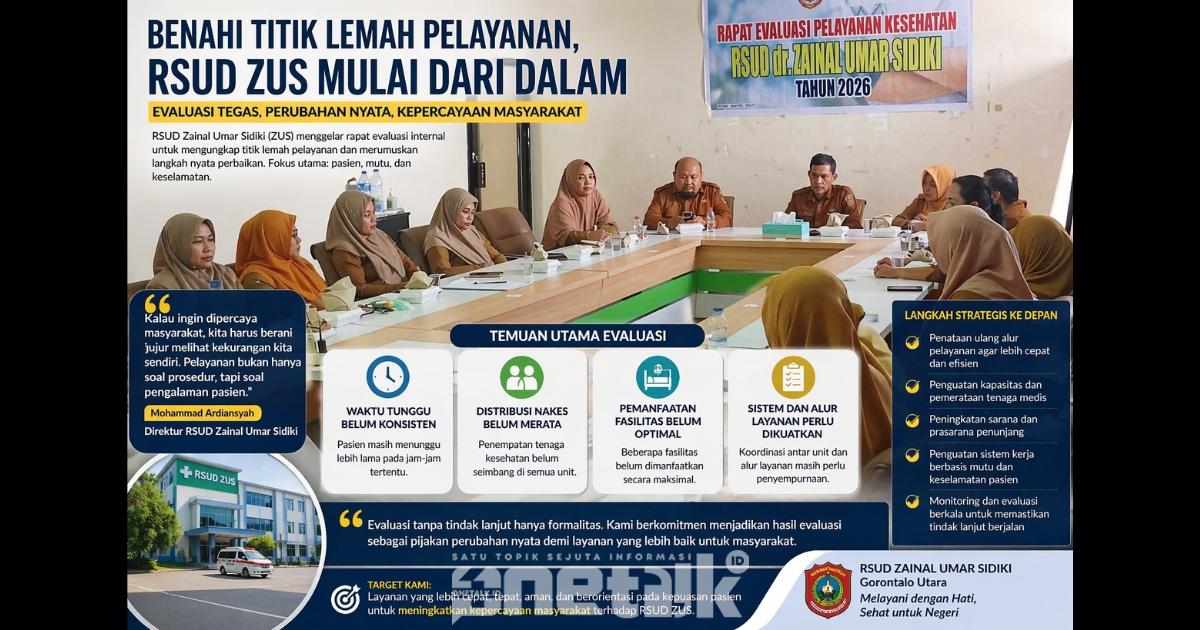Gorontalo Utara – Di tengah meningkatnya tuntutan masyarakat terhadap layanan kesehatan yang cepat dan berkualitas, RSUD Zainal Umar Sidiki memilih jalur tegas: berbenah dari dalam. Evaluasi internal yang digelar manajemen bukan sekadar agenda rutin, tetapi menjadi sinyal bahwa masih ada celah pelayanan yang harus segera diperbaiki.