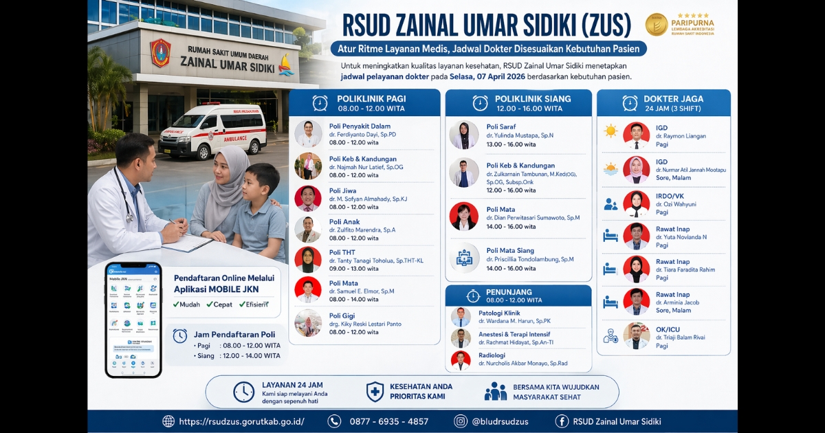 Gorontalo Utara – Transformasi layanan kesehatan terus didorong oleh RSUD Zainal Umar Sidiki (ZUS) melalui penguatan sistem pelayanan yang terintegrasi dan berbasis kebutuhan pasien. Salah satu langkah konkret ditunjukkan lewat penyesuaian jadwal pelayanan dokter pada Selasa, 7 April 2026 yang dirancang lebih sistematis dan adaptif.