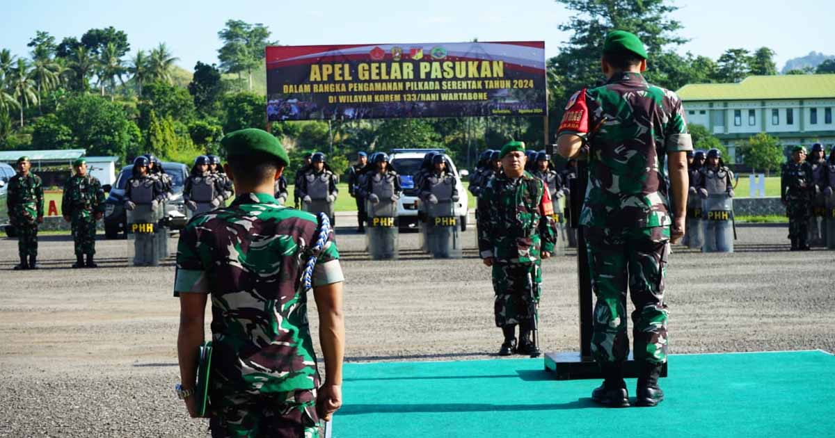 , Gorontalo – Dalam rangka memastikan keamanan dan kesiapan personel untuk mensukseskan pelaksanaan Pemilihan Kepala Daerah (Pilkada) serentak tahun 2024, Korem 133/Nani Wartabone menggelar Apel Pasukan di Lapangan Hitam Makorem 133/NW, Jalan Trans Sulawesi Desa Tridharma, Kecamatan Pulubala, Kabupaten Gorontalo, pada Senin (12/8/2024).