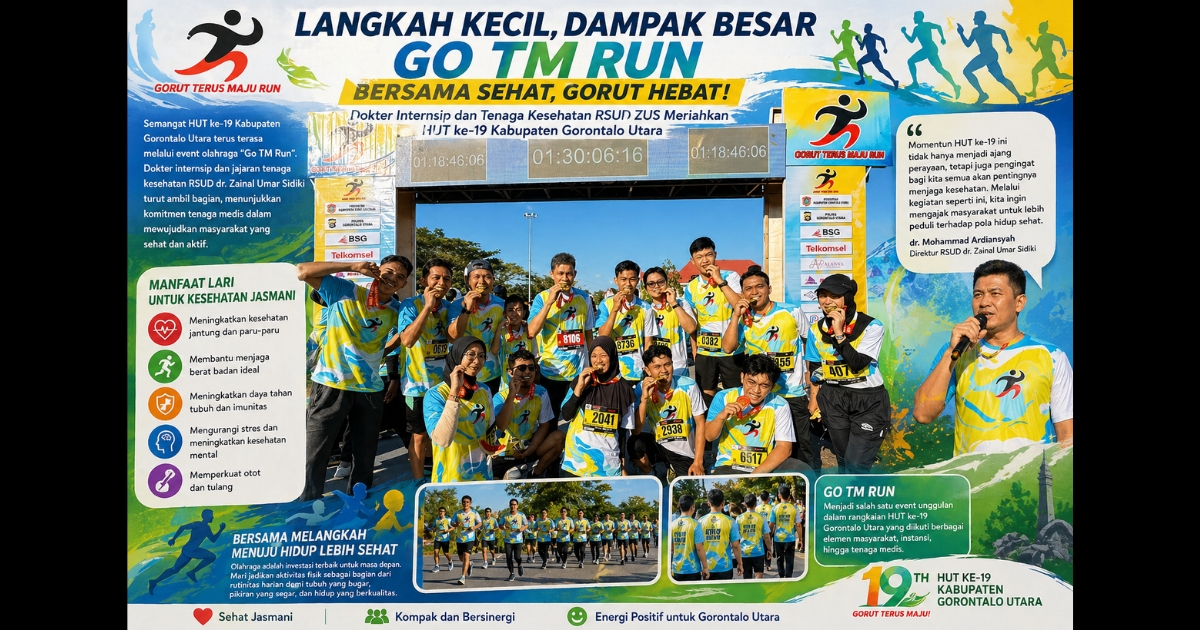Gorontalo Utara – Peringatan Hari Ulang Tahun (HUT) ke-19 Kabupaten Gorontalo Utara tidak hanya menghadirkan kemeriahan seremonial, tetapi juga menegaskan komitmen terhadap pembangunan kesehatan jasmani masyarakat. Hal ini tampak nyata dalam gelaran “Go TM Run”, sebuah event olahraga yang menjadi simbol gerakan hidup bugar dan aktif.