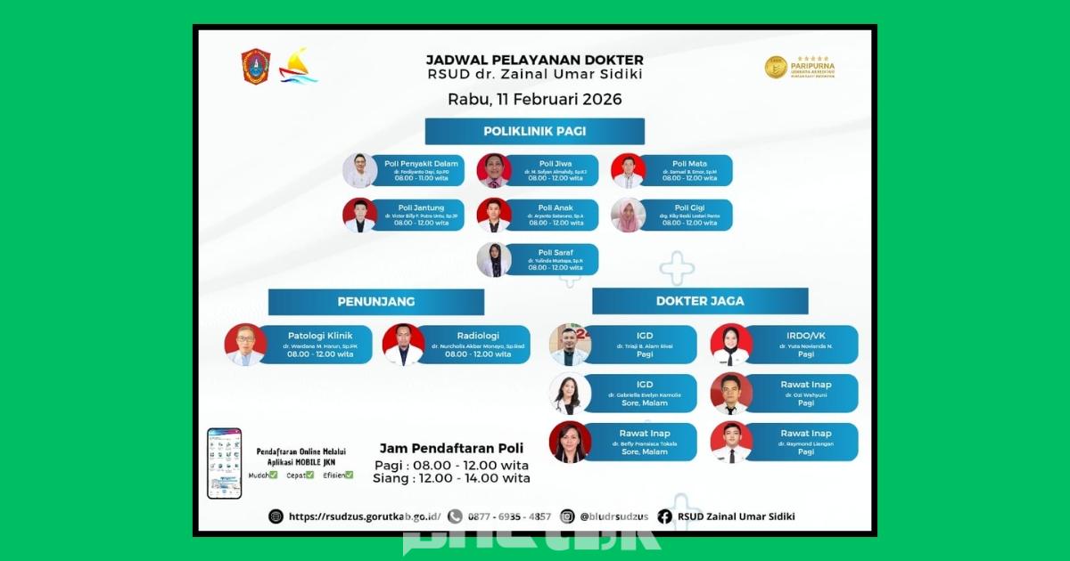 Gorontalo Utara – Rumah Sakit Umum Daerah Zainal Umar Sidiki kembali menunjukkan komitmennya dalam memberikan pelayanan kesehatan yang terstruktur dan mudah diakses masyarakat dengan merilis jadwal praktik dokter untuk Rabu, 11 Februari 2026. Penyampaian jadwal ini menjadi bagian dari upaya peningkatan mutu layanan sekaligus memberikan kepastian bagi pasien dalam merencanakan kunjungan berobat.