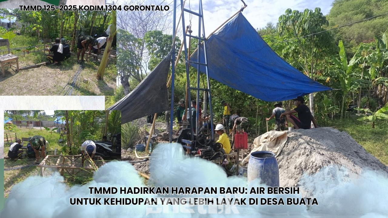Gorontalo – Di tengah hamparan tanah Desa Buata, Kecamatan Botupingge, Kabupaten Bone Bolango, denyut kehidupan kini berdetak lebih kuat. Sabtu (26/07/2025), Satuan Tugas (Satgas) TNI Manunggal Membangun Desa (TMMD) ke-125 Kodim 1304/Gorontalo bersama masyarakat setempat terlihat sibuk merakit besi dan menggali pondasi untuk pembangunan Bak Air. Di balik aktivitas itu, tersimpan harapan besar: menghadirkan air bersih bagi kehidupan yang lebih baik.